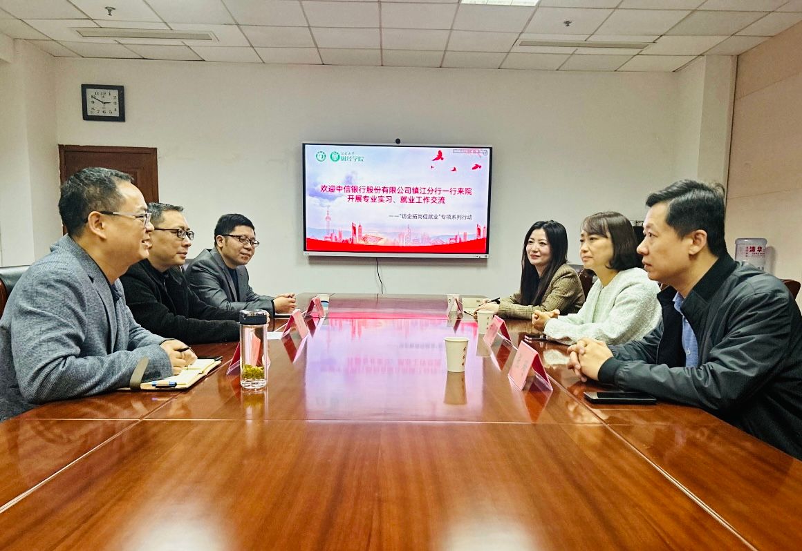 3月30日,应财经学院邀请,中信银行股份有限公司镇江分公司营业部总经理卞沁源、零售银行部总经理张琦、零售银行部副总经理张钰到访学院,开展访企拓岗、深化合作座谈。财经学院党委书记王祥、副院长鄢军、金融系副主任丁国平、学工办主任陈晨热情接待了卞沁源总经理一行。