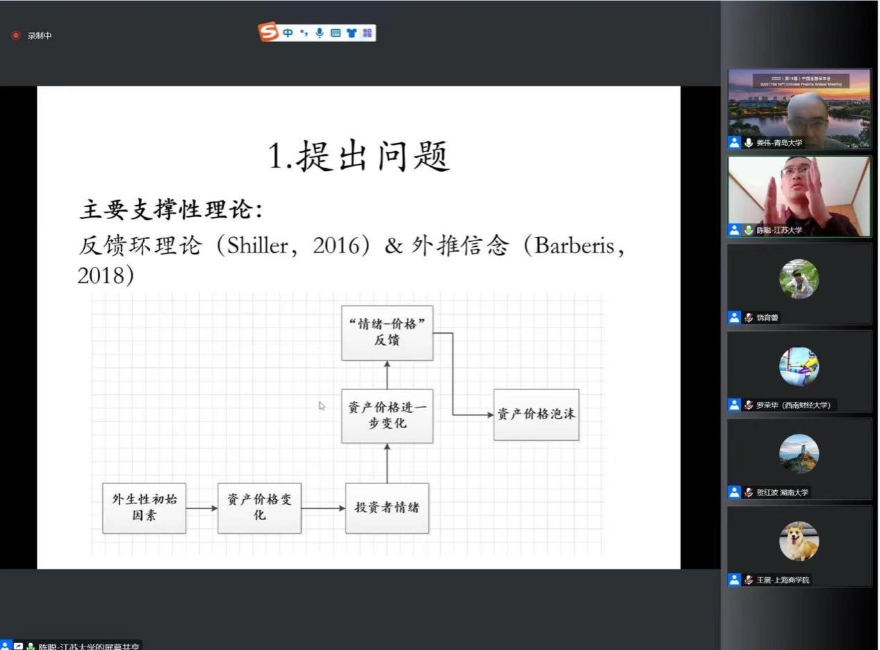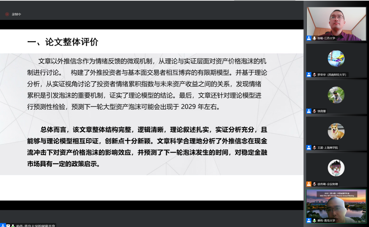 2022年10月29日,由上海交通大学举办的第十九届中国金融学年会以线上与线下相结合的形式举行。华亿在线体育金融系的陈聪博士应邀对其入选年会议程的《外推信念、情绪反馈与资产价格泡沫》论文进行了报告,从理论与实证层面对资产价格泡沫这一金融异象进行了讨论与解释。青岛大学经济学院姜伟教授进行了点评,充分肯定陈聪博士的报告,同时从行文、模型设计等层面对文章提出了建设性意见。在场的专家学者也表示高度赞赏,并结合各自感兴趣的角度,开展了学术对话和交流。