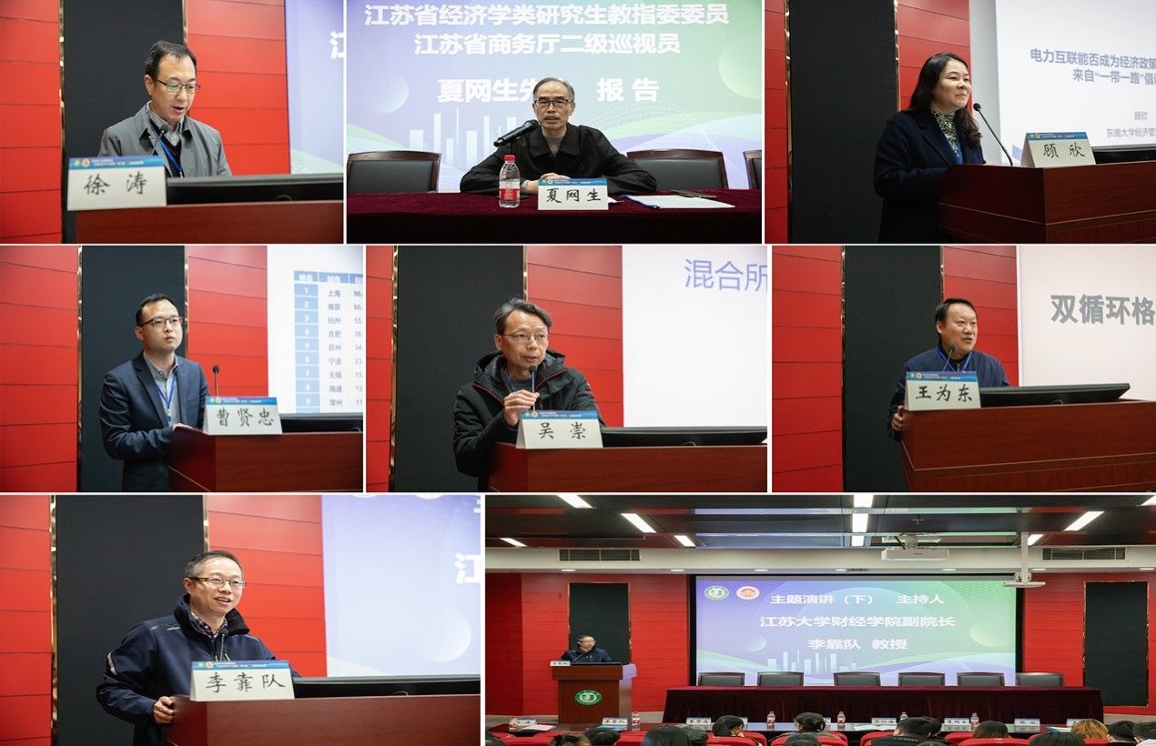 开幕式后,江苏省经济学类研究生教育指导委员会委员、江苏省商务厅二级巡视员夏网生先生,东南大学青年特聘教授、博士生导师、江苏省决策咨询基地首席专家顾欣教授,华东师范大学城市发展研究院院长助理、博士生导师、上海市高校重点智库上海城市发展协同创新中心副主任曹贤忠教授,民盟江苏省委教育工作委员会委员、南京信息工程大学商学院吴崇教授,华亿在线体育国际经济与贸易系主任王为东教授5位专家依次作了主题演讲。主题演讲环节分上下两场进行,分别由徐涛教授和李靠队教授主持。
