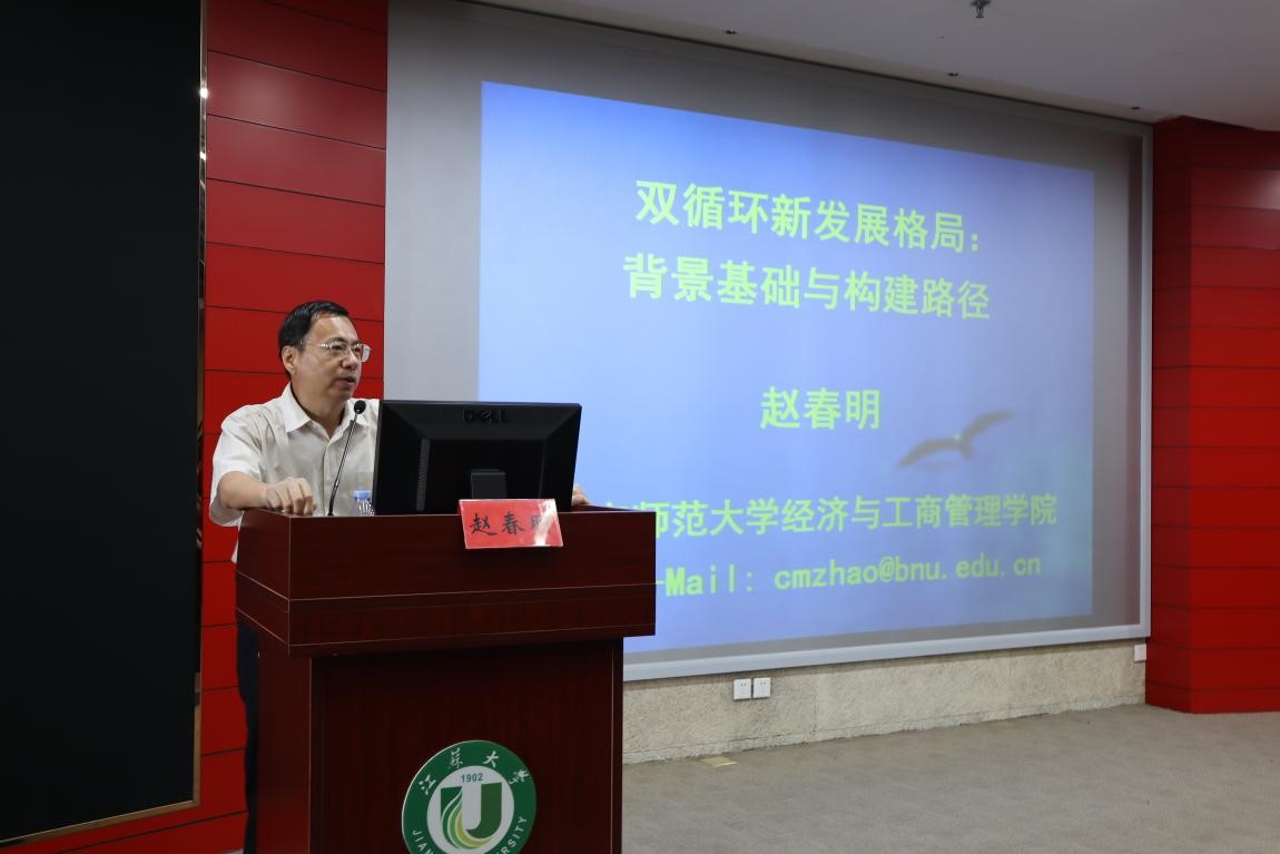 5月8日,北京师范大学经济与工商管理学院特聘教授、博士生导师赵春明教授在图书馆一楼报告厅做了题为“双循环新发展格局:背景基础与构建路径”的主题报告。报告会由校党委副书记李洪波教授主持。来自财经学院的师生聆听了报告会。