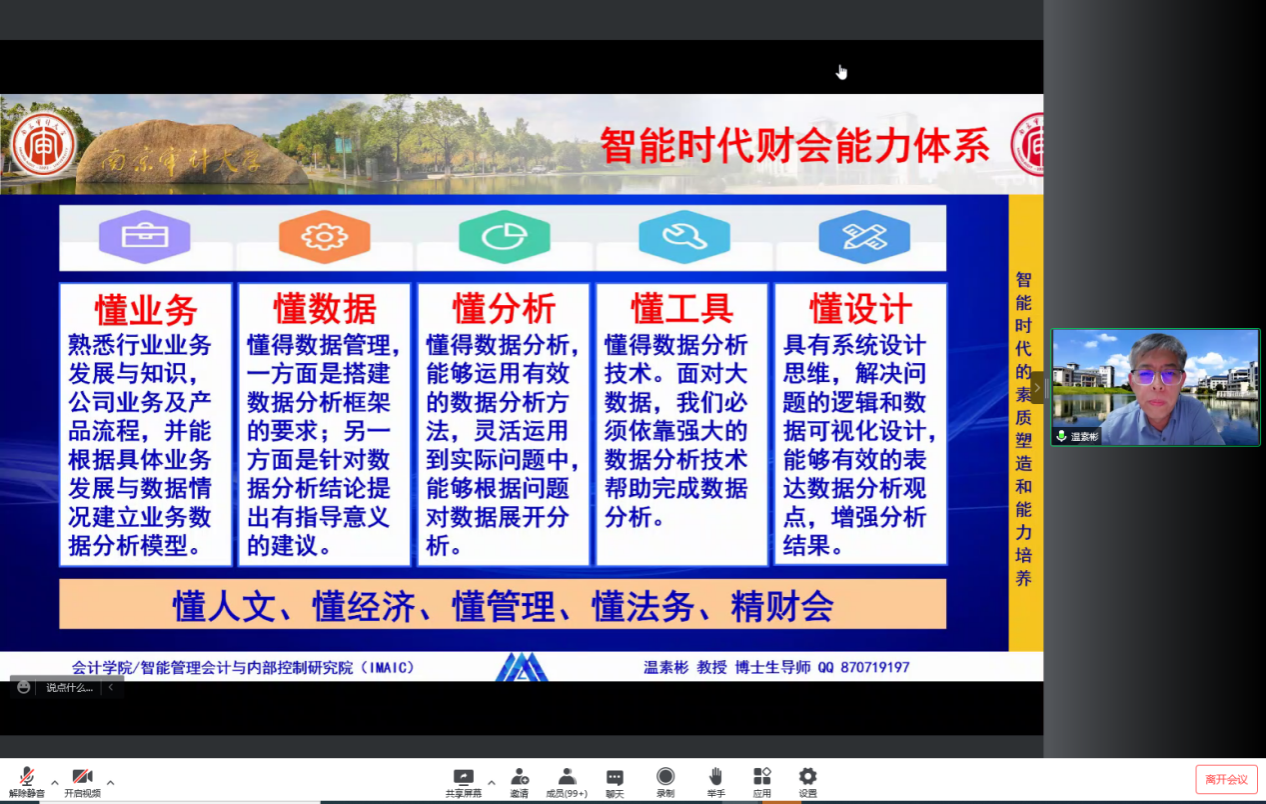 温教授的讲座语言生动、内容丰富,给人以极大的启发。最后互动阶段,温教授还与参会师生围绕智能时代MPAcc毕业生就业、专业技能培养以及具体课程安排等问题进行了深入交流与指导。