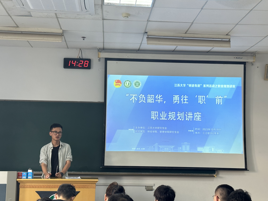 10月18日,财经学院在三江楼302举办“不负韶华,勇往‘职’前”讲座,活动邀请财经学院辅导员吴思远主讲,70余名研究生参加。