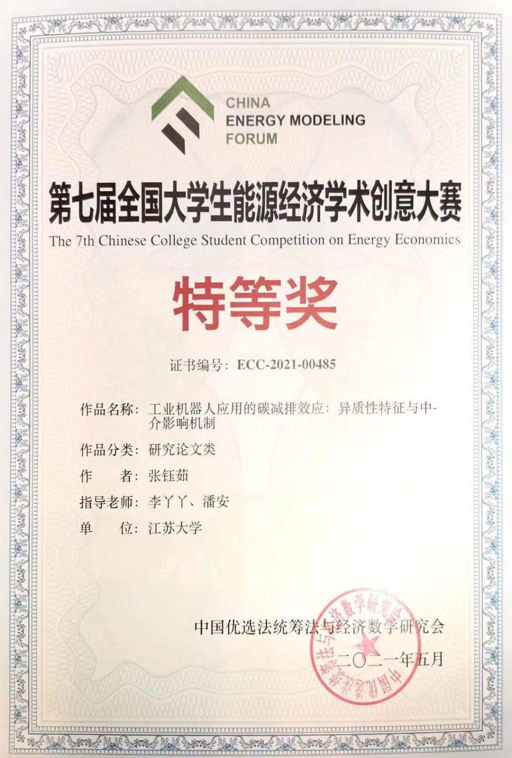2021年5月9日,由中国优选法统筹法和经济数学研究会举办中国“双法”研究会低碳发展管理专业委员会和太原理工大学承办的第七届全国大学生能源经济学术创意大赛总决赛在线上举行,中国工程院工程科技知识中心能源分中心进行了全程直播。由我院李丫丫副教授指导,中南财经政法大学潘安副教授合作指导,我院国际商务硕士研究生张钰茹的作品“工业机器人应用的碳减排效应:异质性特征与中介影响机制”在决赛环节获得研究生作品组特等奖。此外,我院还有一支队伍获得二等奖,两支队伍获得三等奖。
