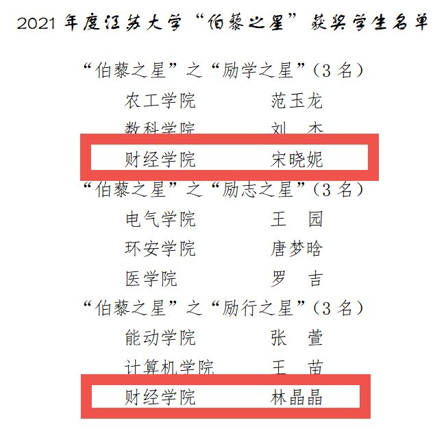 3月底,我校开展了2021年度江苏大学“伯藜之星”评选。经过陶学子个人申报、学院推荐,学校组织评审,我院统计1701班宋晓妮获得江苏大学“伯藜之星”之“励学之星”称号,金融1805班林晶晶获得江苏大学“伯藜之星”之“励行之星”称号。
